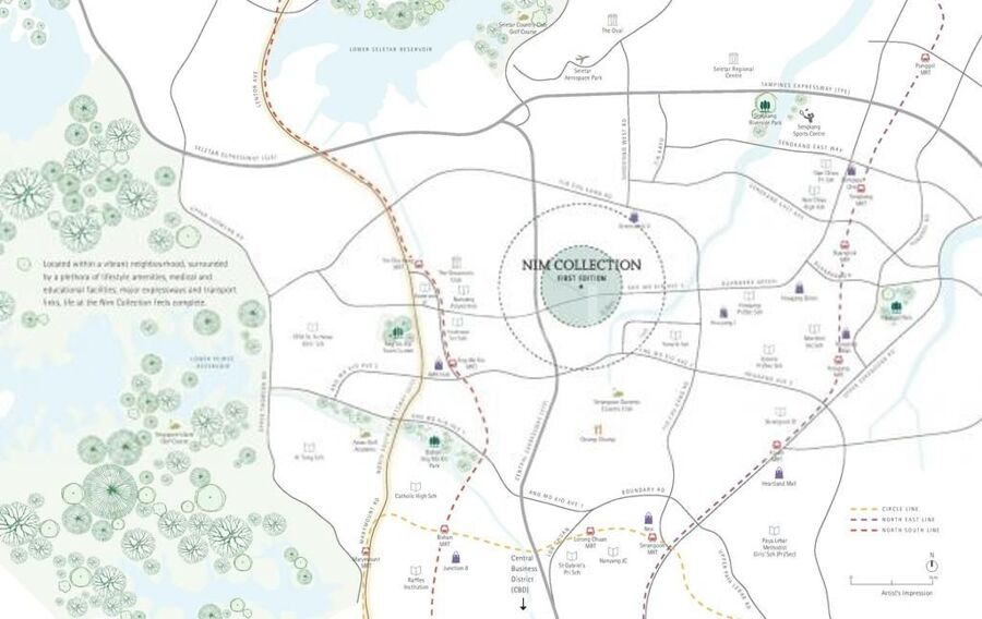 The closest MRT station with Nim Collection is the NS15 Yio Chu Kang of the North South Line, which is approximately 2.6KM away while the other MRT station available nearby is the NE15 Buangkok of the North East Line.