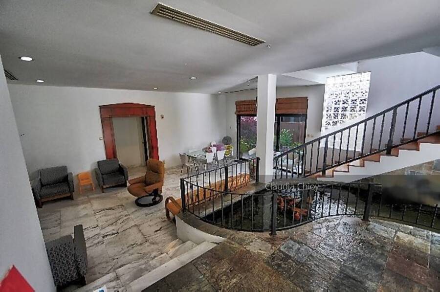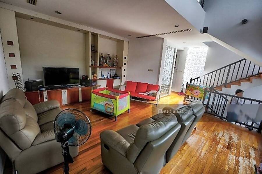 House is in original condition and well maintained. North south facing with main door facing the south thus good cross breeze. It has an unique design that connects the fish pond from the garden area into the house bringing a tranquil and relaxing water flowing sound. The house has a total of 4 bedrooms and 5 bathrooms with a large master bedroom and a double volume family area located on the 2nd floor for family bonding. It has a good sized garden with well maintain flora. It is presently tenanted at S$4000.00 with a 4 months notice to break lease.